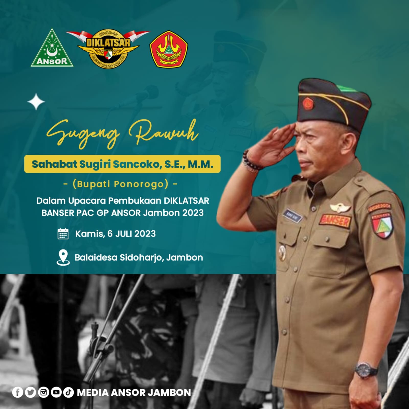 Tahun 2023 ini, GP Ansor PAC Jambon menggerlar Diklatsar Banser yang berlokasi di Desa Sidoharjo, dengan jumlah peserta mencapai 51 orang.