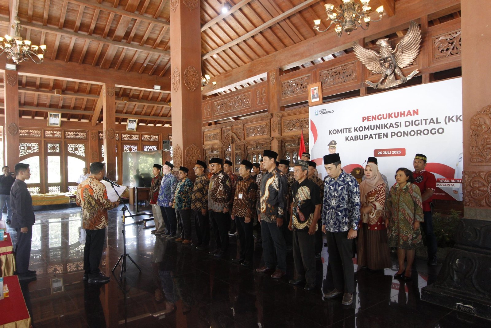 Aswaja News – Bupati Sugiri Sancoko mengukuhkan Komite Komunikasi Digital (KKD Kabupaten Ponorogo di Pendopo Agung pada Rabu (26/7/2023). Kang Giri –sapaan Bupati Sugiri Sancoko—mengatakan perlunya mediator ketika terjadi misinformasi dan disinformasi yang telanjur beredar di ruang publik melalui paltform media sosial. Fungsi mediasi itu dilakukan oleh KKD. ‘’Mau atau tidak mau, zaman ini menuju pada sesuatu tidak kasat mata yang bernama digital. Maka dari itu kita membutuhkan penengah ketika muncul persoalan dampak komunikasi digital,’’ katanya.