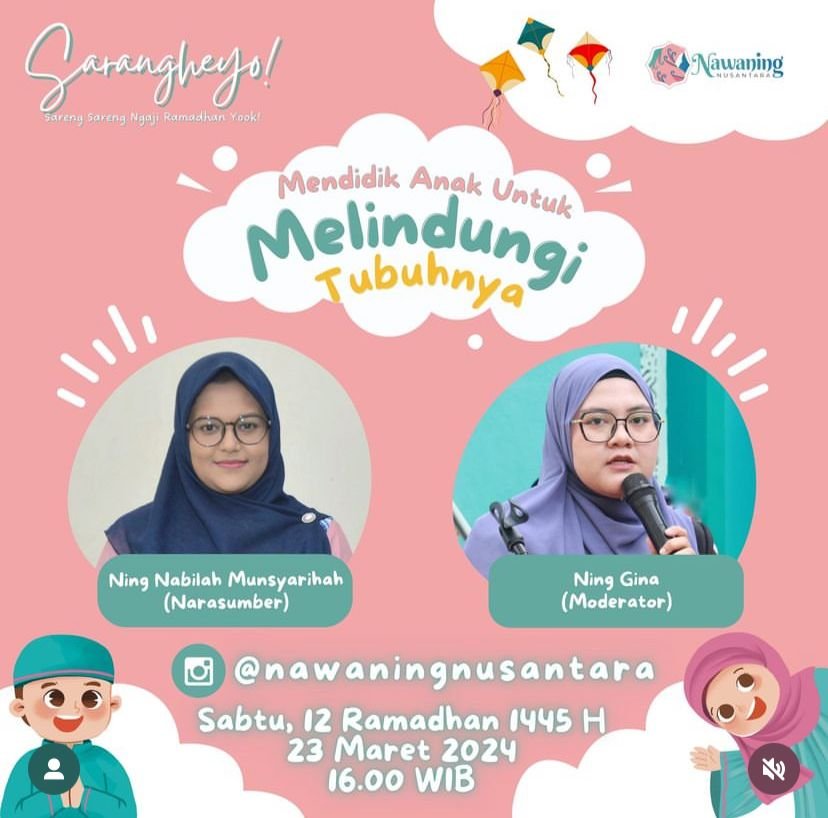 Aswaja News – Maraknya kasus pelecehan seksual, hingga kini masih menjadi sorotan. Maka dalam hal ini anak harus dibekali pendidikan seksual sejak dini. Oleh karena itu, akun instagram @nawaningnusantara berinisiasi menggelar kajian yang bertema “Mendidik Anak Untuk Melindungi Tubuhnya” dalam bingkai kegiatan Sarangheyo (Sareng-Sareng Ngaji Ramadhan Yuk) pada Sabtu (23/03/2024).