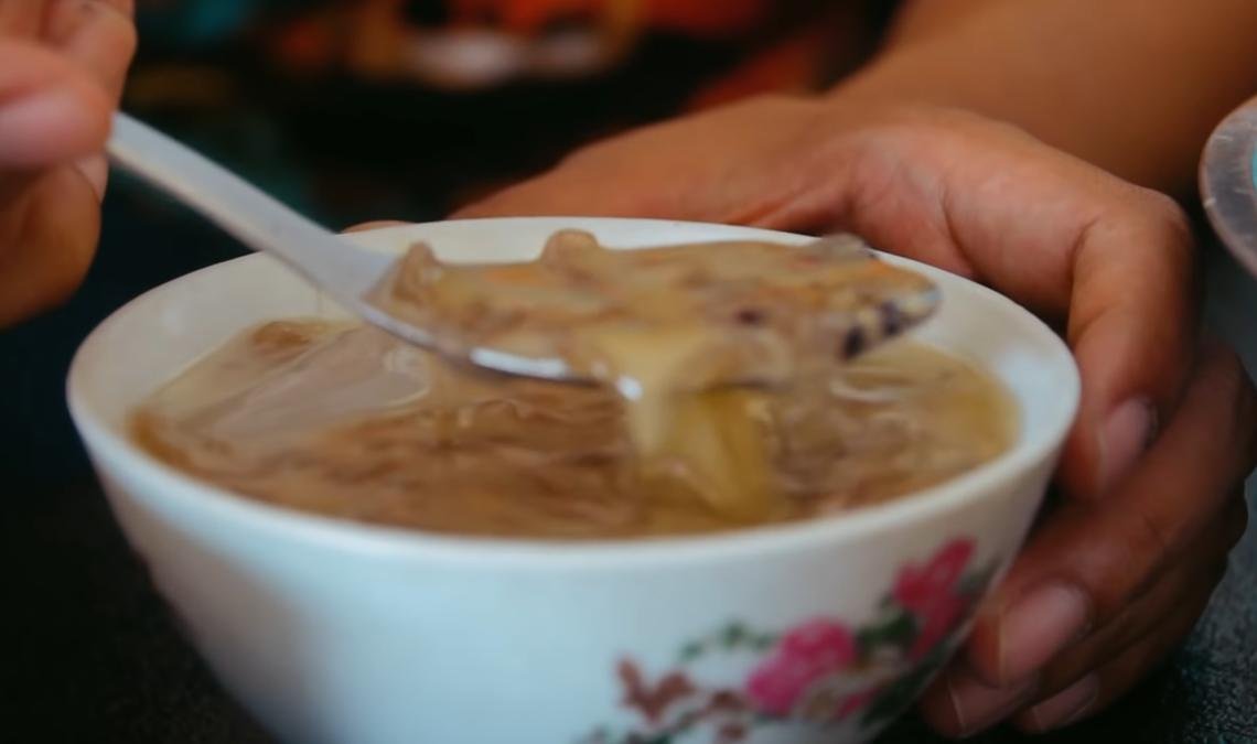 Cendol aren memiliki warna pucat dan tekstur kenyal.