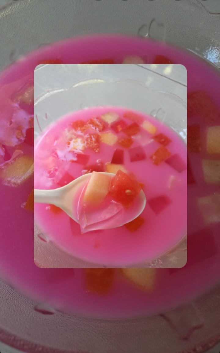 • Campurkan semua buah yang sudah disiapkan dan juga jelly kedalamnya