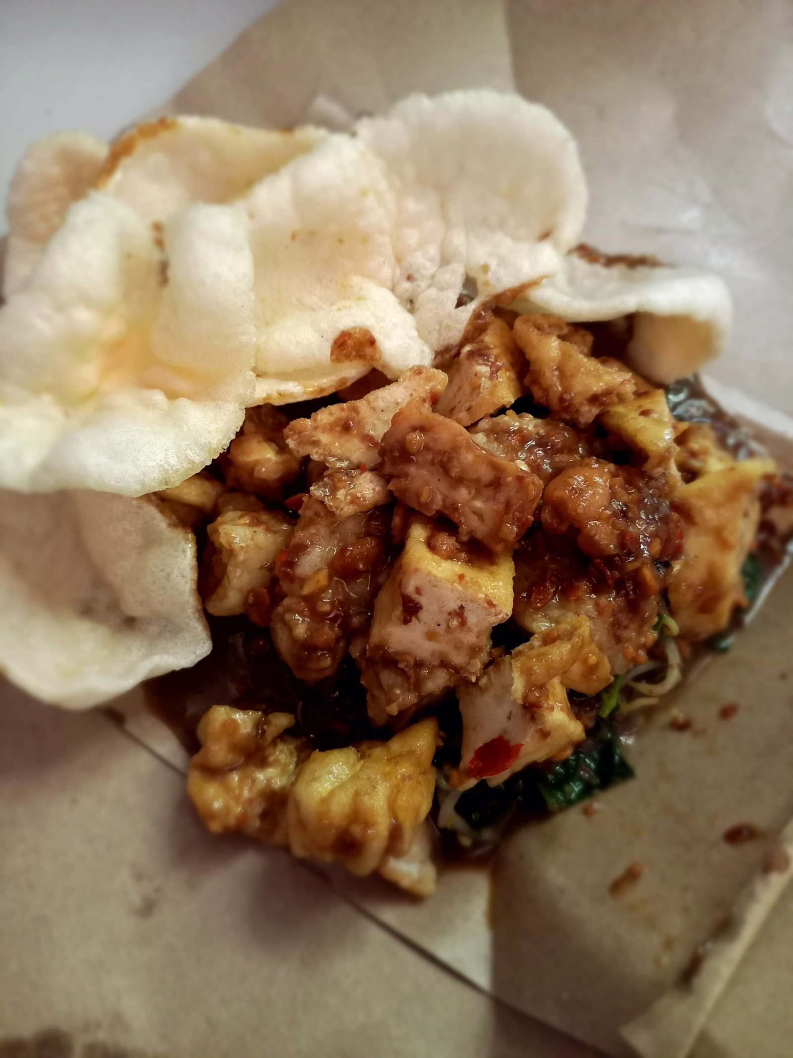Kuliner dengan isian kangkung, tahu, tempe, tauge, bengkuang, timun, lontong kemudian diguyur dengan saus kacang dengan bahan dasar petis, cabai, kacang tanah, bawang goreng, gula merah, garam membuat rasanya semakin lengkap.
