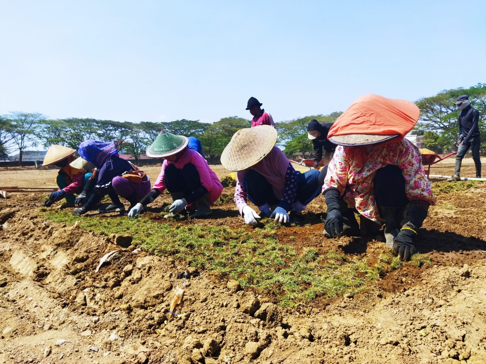 Mulai pagi, rumput yang berasal dari Kabupaten Malang tersebut langsung diturunkan dari truk utuk selanjutnya segera dilakukan penanaman oleh pekerja yang ditugaskan.