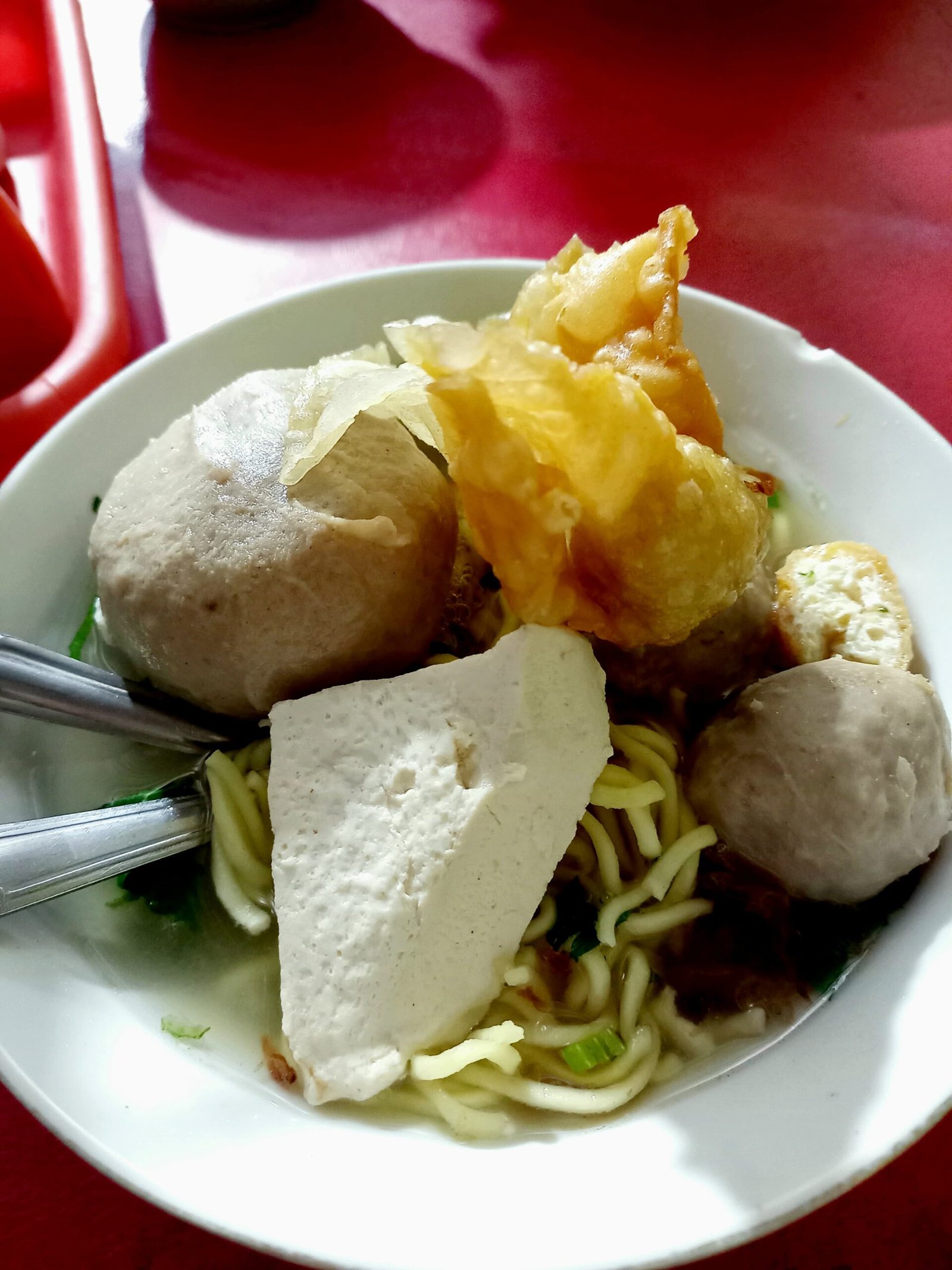 Isi dalam satu porsi bakso mereka beragam, tergantung bakso apa yang kalian pesan. Contohnya ketika kalian memesan bakso telur, kalian akan mendapat satu bakso telur besar, dua bakso kecil, tahu putih, irisan tahu coklat, pangsit, mie dan juga sayur.