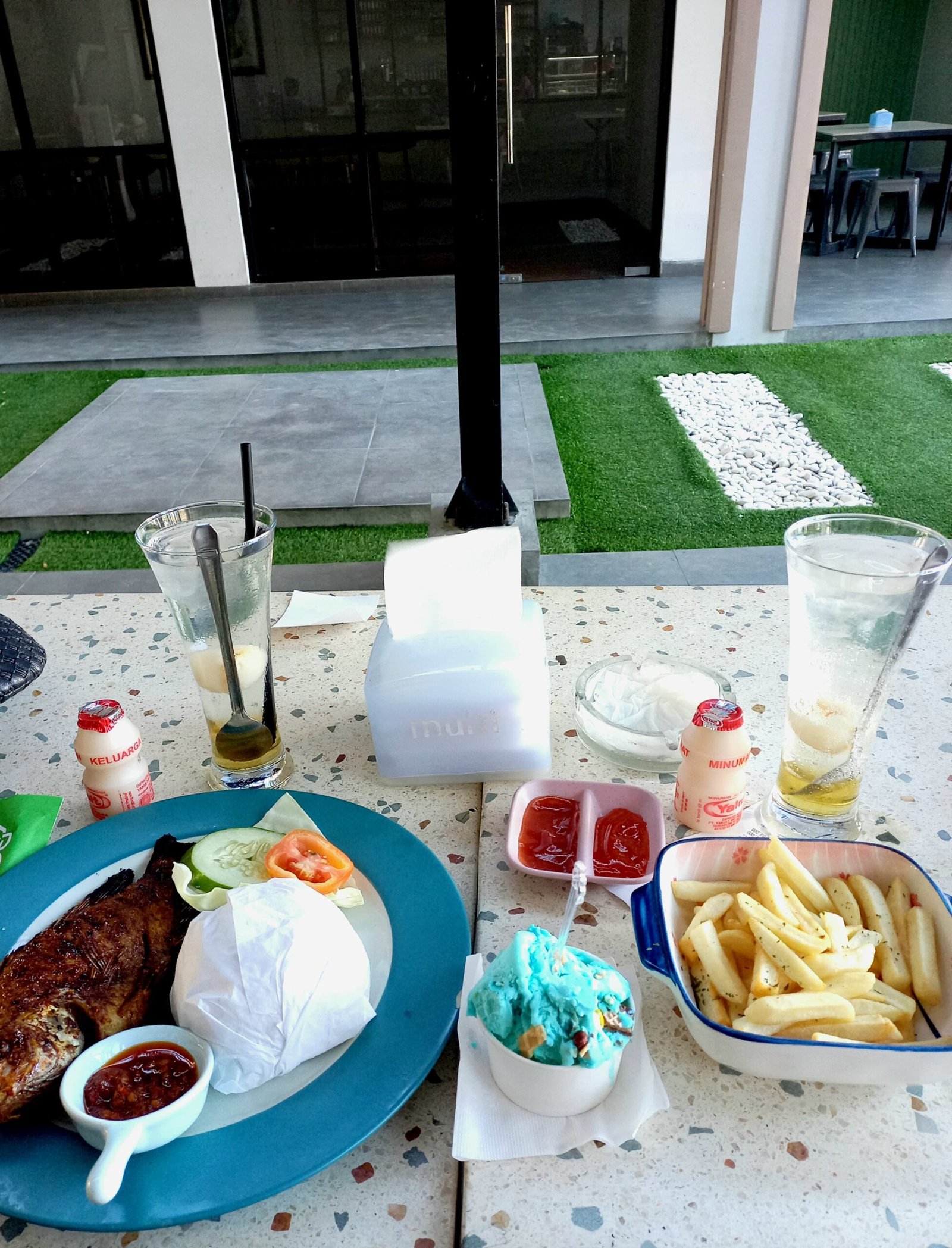 Menu Nusantara mereka seperti penyetan, nila bakar, nasi goreng, iga bakar dan masih banyak lagi. Lalu menu western mereka ada american burger, fish and chip dan lainnya. Rekomendasi untuk menu utama kalian wajib coba ikan nila bakar, sensasi aroma bakar berpadu dengan lembutnya daging ikan dan juga sambal membuat kenikmatan yang sempurna dengan porsi yang cukup mengeyangkan.