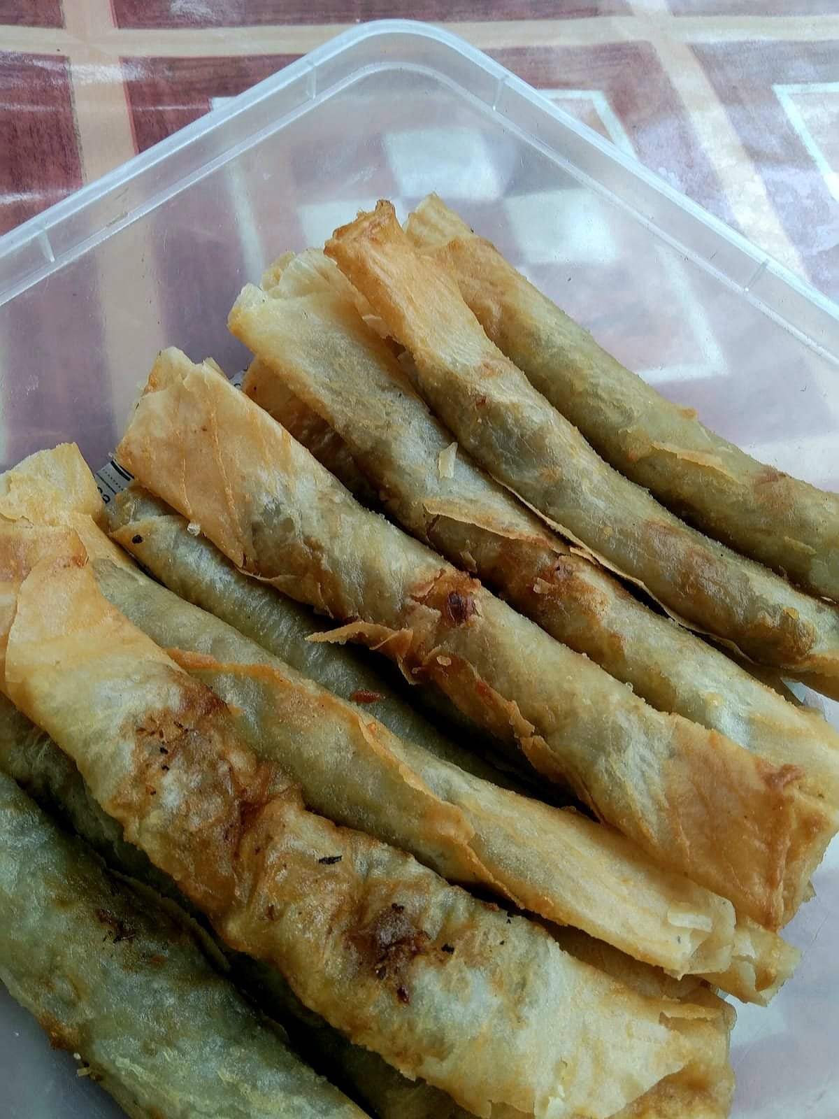 • Gulung kulit lumpia hingga bentuk memanjang lalu bagian yang terbuka kalian rekatkan dengan larutan tepung tadi
