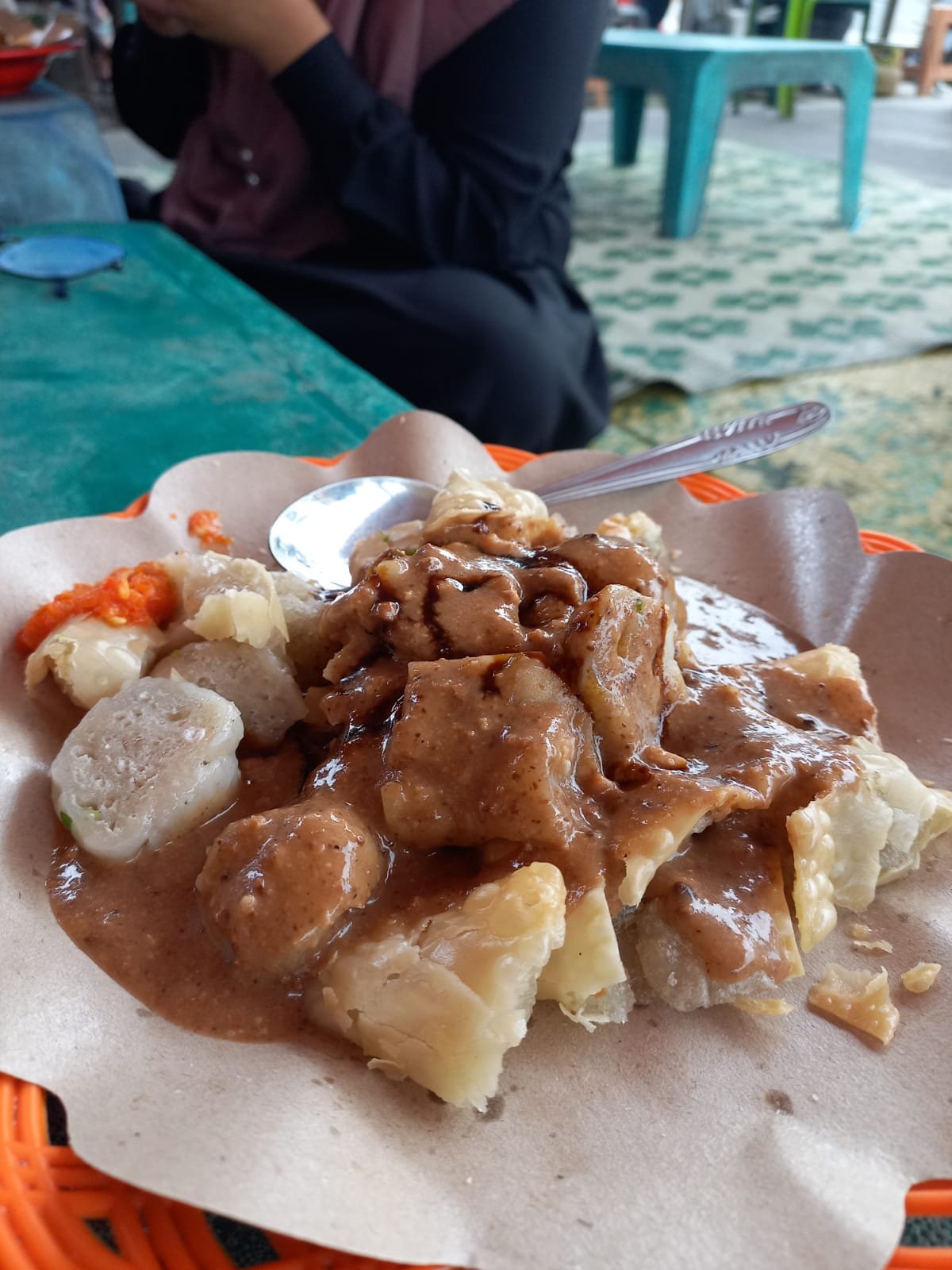 Penyajiannya dengan bumbu kacang yang kental dan gurih terbuat dari kacang tanah yang dihaluskan, gula merah, bawang putih, dan cabai. Kemudian ditambah dengan kecap manis, saus sambal, dan sedikit perasan jeruk limau yang memberikan sentuhan segar pada rasa.