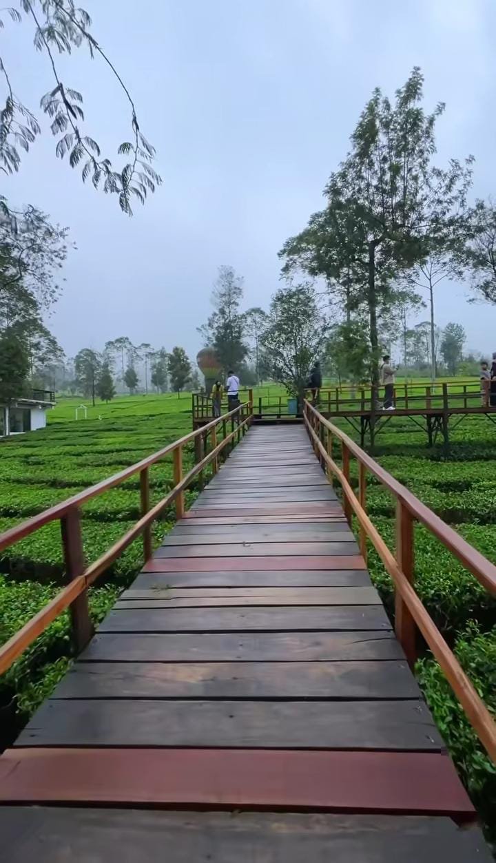 Jembatan kayu sederhana yang membentang di atas kebun teh juga memberikan pengalaman berjalan di tengah hamparan hijau. Spot ini menjadi salah satu tempat favorit untuk selfie atau foto keluarga. Karena perpaduan warna coklat dari jembatan dan hijau dari kebun teh menjadi perpaduan sempurna.