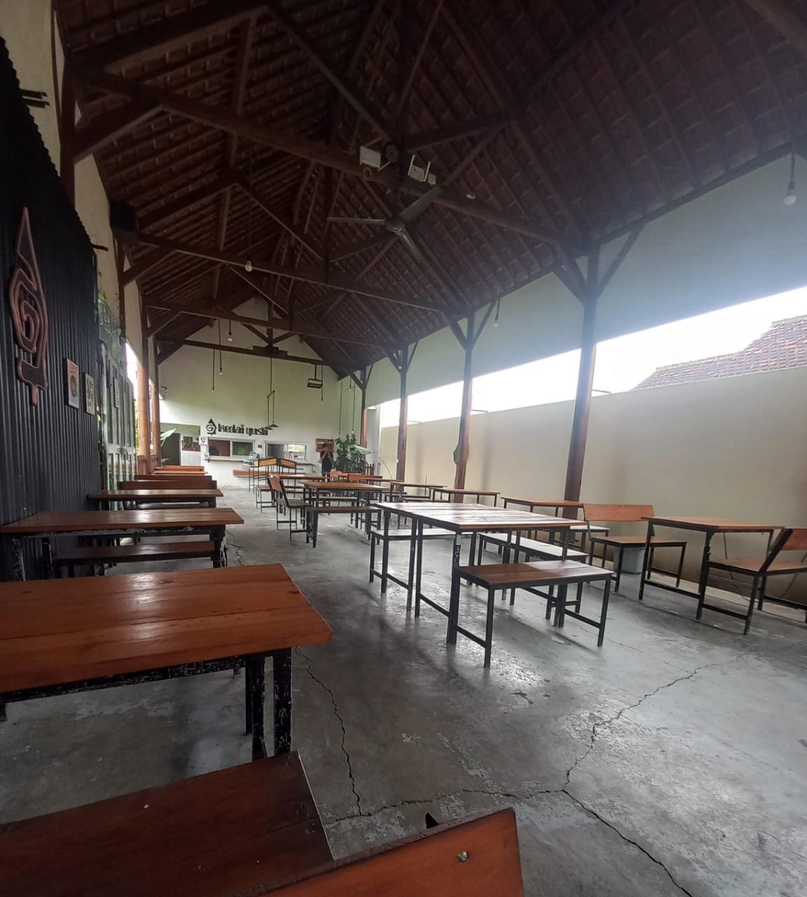 Elemen-elemen kayu dan tata letak yang rapi membuat tempat ini terasa lebih lapang dan nyaman. Tidak hanya itu, keberadaan kolam ikan di bagian depan semakin mempercantik suasana, menambah kesan alami dan memberikan efek menenangkan bagi pengunjung.