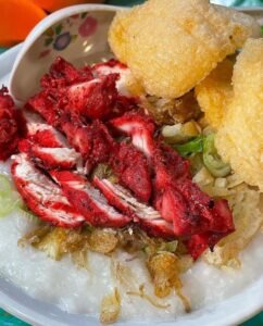Menu andalan yang wajib dicoba tentu saja bubur ayamnya, yang terkenal dengan tekstur lembut, topping ayam suwir yang melimpah, bawang goreng renyah, cakwe, dan kuah kaldu yang gurih. Bubur ayam di sini memiliki cita rasa khas yang berbeda dari bubur ayam biasa, sehingga menjadi favorit banyak pengunjung.