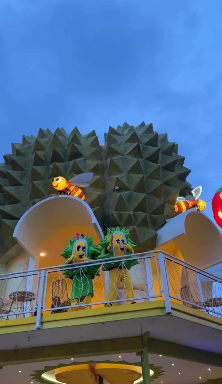 Salah satu tempat yang paling menarik perhatian adalah rumah kaca dengan interior bertema durian, di mana pengunjung bisa merasakan sensasi berada di dalam dunia durian yang penuh warna. Dengan pencahayaan yang menarik dan desain interior yang unik, rumah kaca ini menjadi salah satu spot favorit bagi para pengunjung.