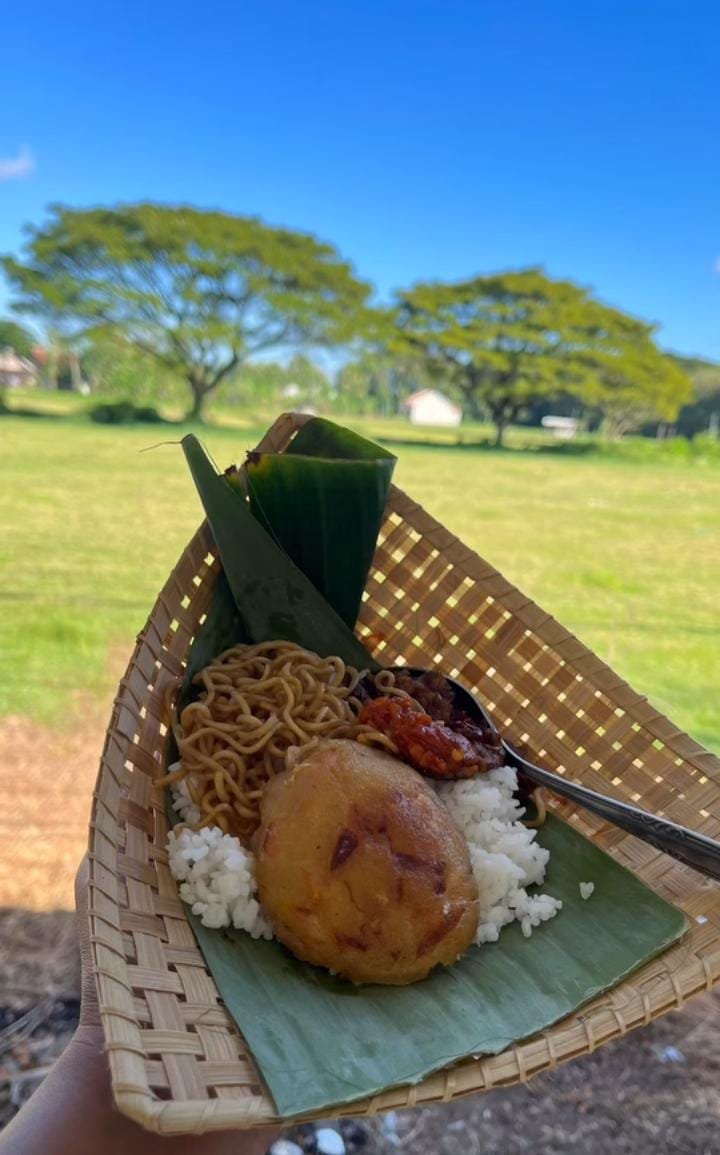 Menu andalan di Warung Sami Dugi adalah seporsi nasi kering yang disajikan dalam pincuk bambu beralas daun pisang. Nasi putih hangat disandingkan dengan lauk-lauk sederhana seperti mie goreng kering, tempe kering manis, dan pia-pia gorengan khas berisi sayur yang mirip bakwan namun lebih pipih dan garing di bagian pinggirnya.