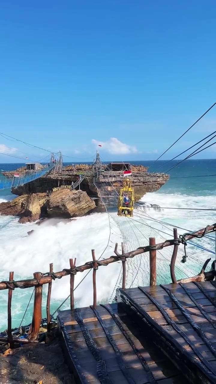 Menyeberangi lautan sejauh 100 meter dengan gondola bukan pengalaman biasa. Dengan ketinggian mencapai 11 meter dan ombak yang menggulung kencang di bawah, siapapun yang mencoba pasti akan merasakan adrenalin memuncak.
