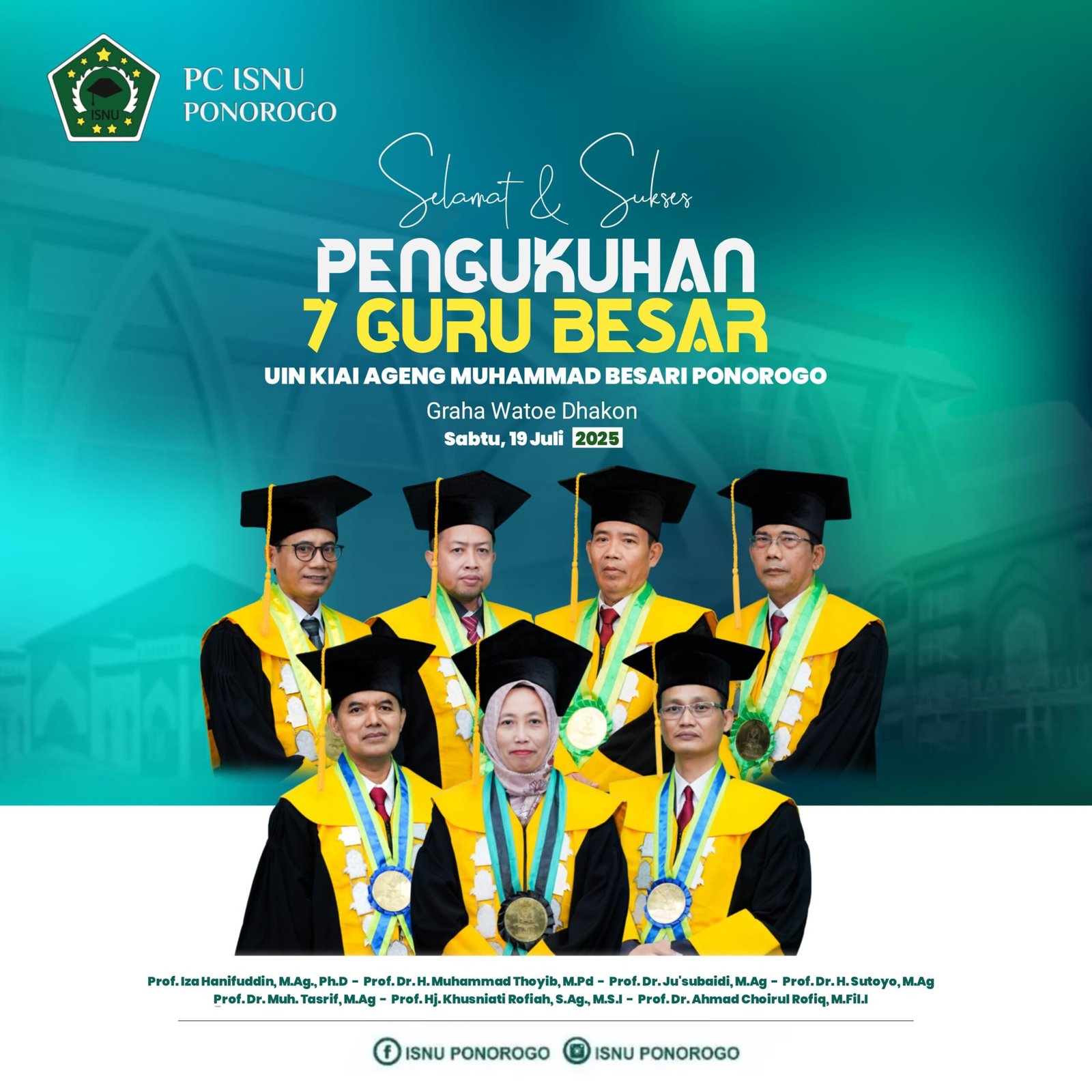 Ketujuh Guru Besar baru tersebut adalah Prof. Iza Hanifuddin, M.Ag, Ph.D (Bidang Fiqh Muamalah), Prof. Dr. Hj. Khusniati Rofi’ah, M.S.I. (Bidang Hukum Ekonomi Syari’ah), Prof. Dr. Muh. Tasrif, M.Ag (Bidang Tafsir Tematik Isu-Isu Sosial), Prof. Dr. H. Sutoyo, M.Ag (Bidang Ilmu Tasawuf), Prof. Dr. Ahmad Choirul Rofiq, M.Fil.I (Bidang Sejarah Peradaban Islam), Prof. Dr. Ju’subaidi, M.Ag (Bidang Penelitian dan Evaluasi Pendidikan), Prof. Dr. H. Muhammad Thoyib, M.Pd (Bidang Manajemen Mutu Pendidikan Islam).