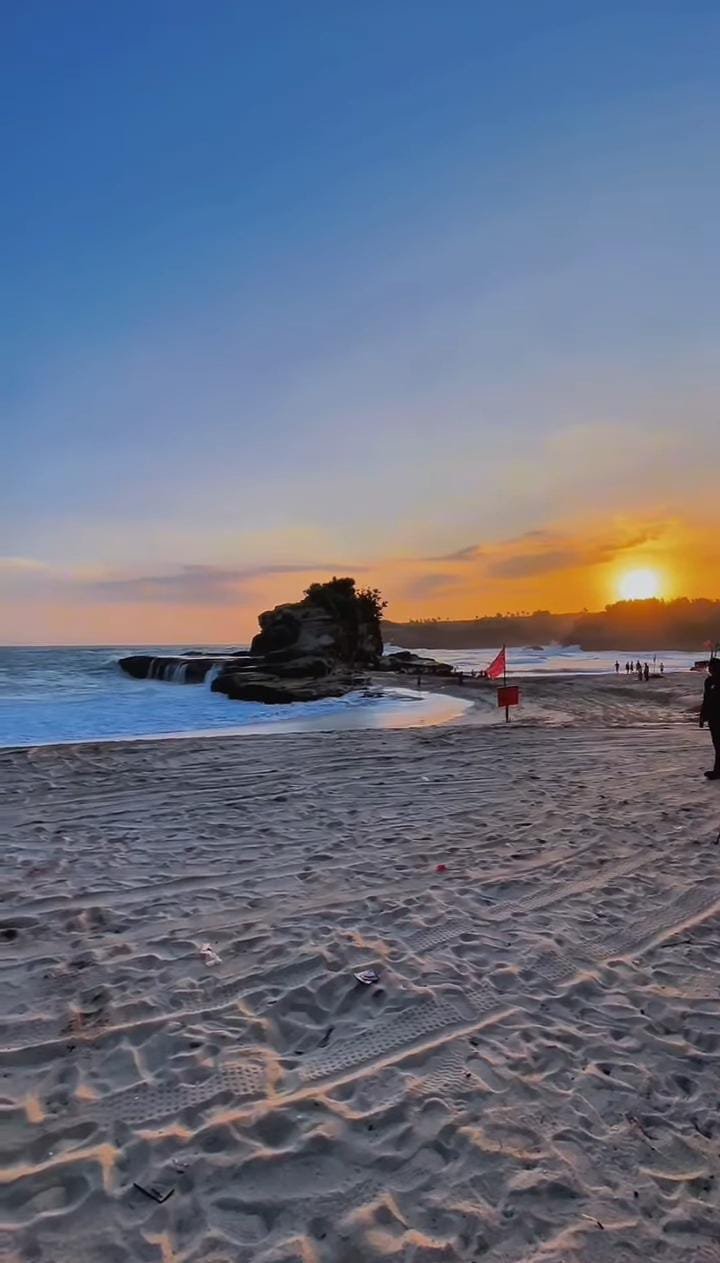 Pantai ini menawarkan panorama yang luar biasa, hamparan pasir putih bersih, laut biru jernih, deretan pohon kelapa, dan batu karang besar yang tampak gagah menghadang deburan ombak.