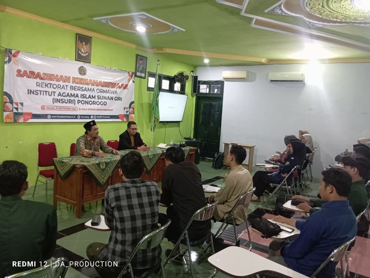 AswajaNews – Institut Agama Islam Sunan Giri (INSURI) Ponorogo menggelar Sarasehan Kemahasiswaan bersama jajaran pengurus organisasi mahasiswa (Ormawa) di Aula Aswaja, Senin (16/9/2025). Kegiatan ini dihadiri oleh Rektor INSURI Ponorogo, Wakil Rektor III Bidang Kemahasiswaan Dr. Arik Dwijayanto, M.A., Wakil Rektor II Bidang Keuangan Dr. Samsudin, M.Pd., serta perwakilan pengurus Dema/Sema Institut, Dema Fakultas, HMPS, dan UKM.