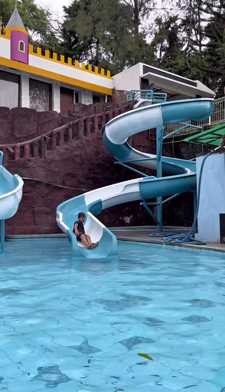 Di dalamnya, terdapat berbagai wahana menarik seperti seluncuran air warna-warni, ember tumpah raksasa, kolam anak, hingga kolam dewasa dengan pemandangan menawan. Tidak hanya anak-anak, orang dewasa pun bisa menikmati momen relaksasi sembari bermain air atau sekadar bersantai di tepi kolam menikmati udara segar khas lereng gunung.