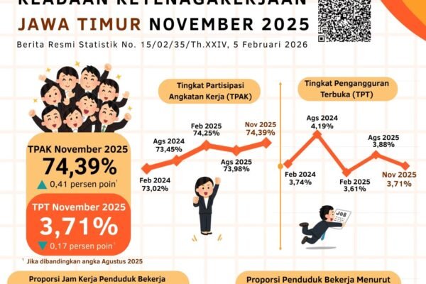 AswajaNews – Kabar positif datang dari pasar tenaga kerja Jawa Timur di penghujung tahun 2025. Berdasarkan data terbaru per November 2025, jumlah angkatan kerja di Provinsi Jawa Timur tercatat mencapai 24,96 juta orang. Angka ini menunjukkan pertumbuhan yang signifikan dengan penambahan sebanyak 194,96 ribu orang dibandingkan posisi Agustus 2025. Kenaikan ini juga diikuti dengan meningkatnya…
