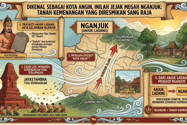 AswajaNews – Banyak yang mengenal Nganjuk hanya sebagai “Kota Angin”, namun sedikit yang menyadari bahwa nama kabupaten ini menyimpan rahasia kemenangan besar di masa lalu. Berasal dari kata “Anjuk Ladang”, Nganjuk secara harfiah berarti “Tanah Kemenangan”. Mengapa disebut tanah kemenangan? Mari kita telusuri lorong waktu menuju abad ke-10, saat sebuah prasasti menjadi saksi bisu lahirnya…