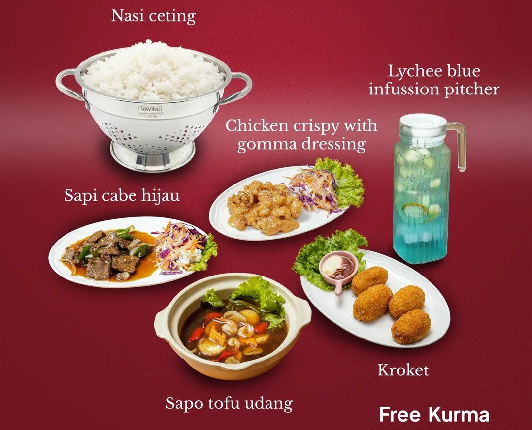 Dalam setiap paket, pengunjung akan disuguhkan berbagai menu yang cukup beragam dengan perpaduan cita rasa khas Asia. Beberapa hidangan yang tersedia antara lain ayam koloke yang memiliki rasa gurih manis, sapo tofu ayam yang lembut dan hangat, hingga pakcoy udang yang segar. Selain itu, terdapat pula pilihan menu lain seperti sapi cabai hijau, sapi lada hitam, ayam mentega, hingga gurame bakar yang cocok dinikmati bersama dalam satu meja.