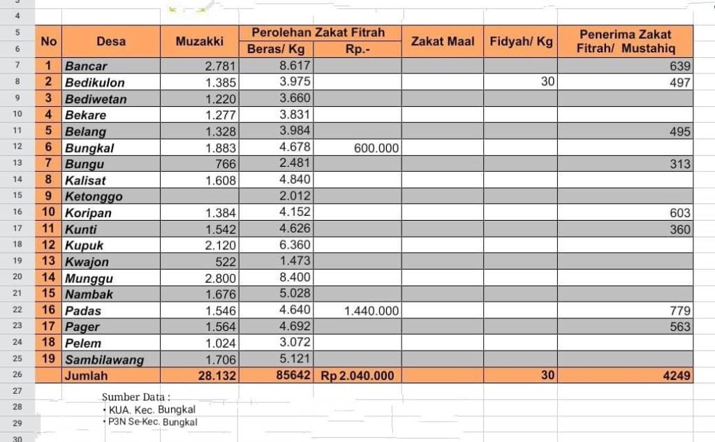 Dari sisi penyaluran, jumlah penerima zakat (mustahiq) di seluruh desa se-Kecamatan Bungkal tercatat sebanyak 4.249 orang, yang tersebar merata sesuai kebutuhan di masing-masing wilayah.